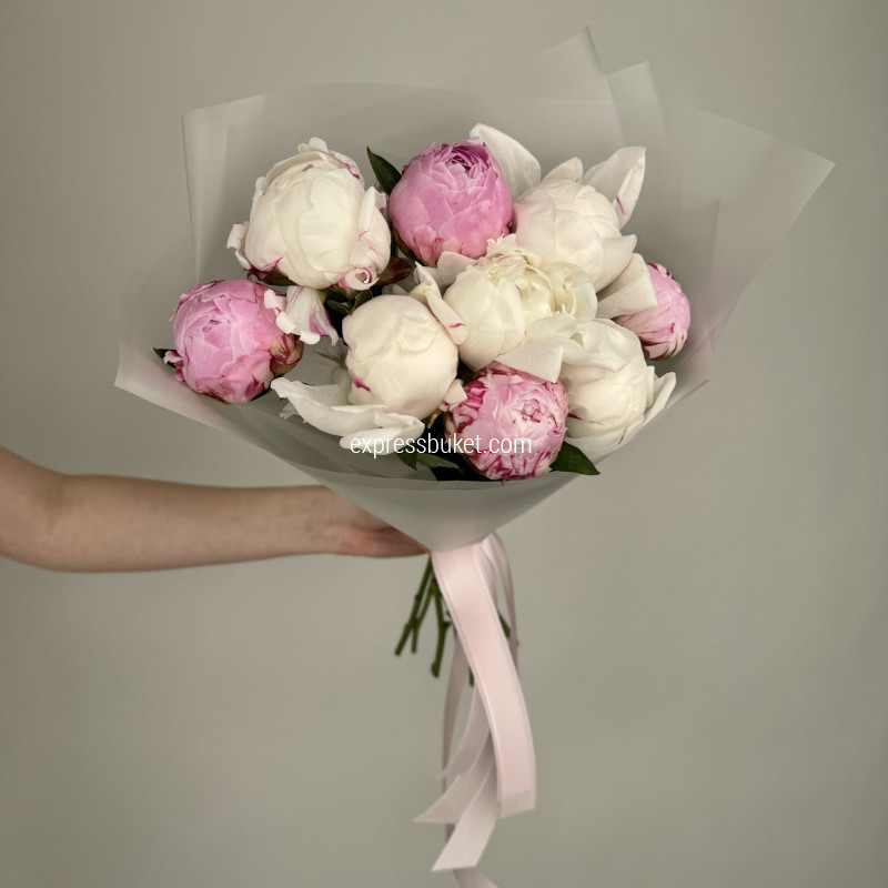 Пион - 9;Современная упаковка - 1;Лента атласная - 1;