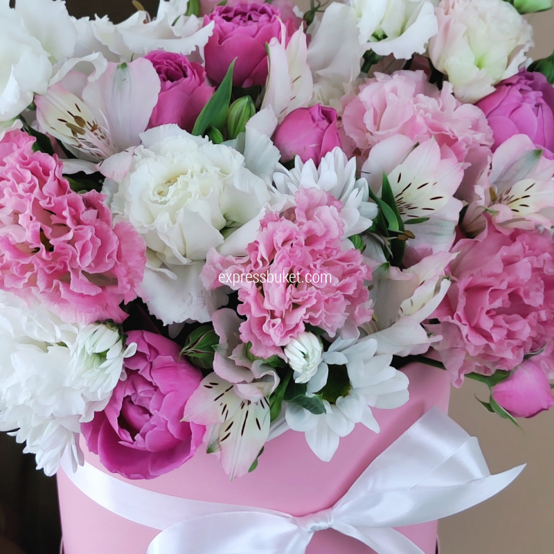 Коробка шляпная средняя (от 12 до 21 см) - 1;Оазис - 1;Эустома - 5;Альстромерия - 2;Роза кустовая пионовидная - 2;Хризантема кустовая белая - 2;